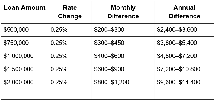 Even a small move in rates can have a significant impact. Every 0.25 percent change in Mortgage rates equals roughly $40 to $60 per month per $100,000 borrowed. Let’s look at how that affects Austin’s most common high-end loan amounts.